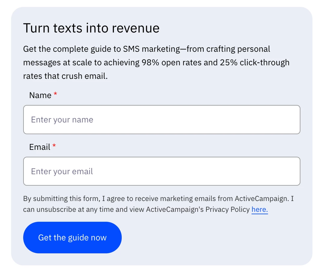 Built-in compliance: Don’t worry about compliance regulations. ActiveCampaign offers A2P 10DLC registration, automatic opt-out processing, and GDPR-ready features that handle the legal complexity so you can focus on results.