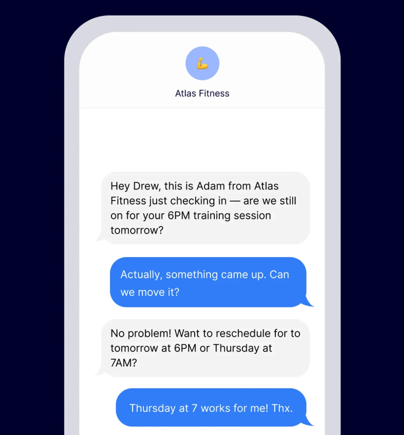 These are two-way interactions that feel personal—appointment reminders with reply options, feedback requests, or customer service conversations.