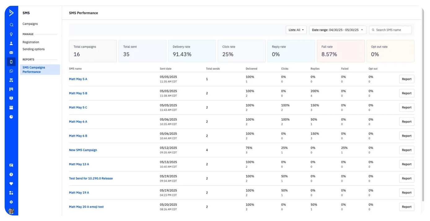 ActiveCampaign's Aggregate Campaign Performance Reporting provides a centralized view of your broadcast SMS campaign performance so that you can better analyze impact, make faster decisions, and demonstrate value.